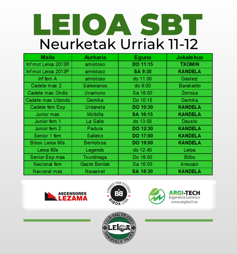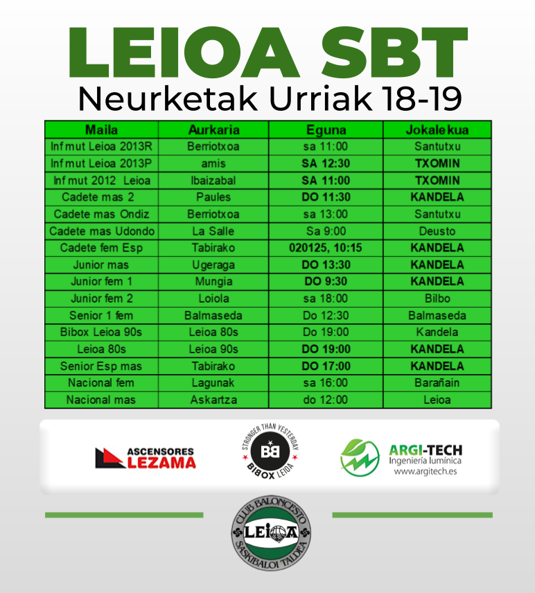 El domingo doble ración. Por la mañana las cadetes de Pedro reciben a Urdaneta a las 10:30h y las junior de Ekain hacen lo propio con Padura a las 12:30h. Por la tarde, turno para las senior de Txutxi, que reciben a Salleko a las 17:00 y Bibox Leioa 90s, que cierra la jornada a las 19:00h frente a Berriotxoa.