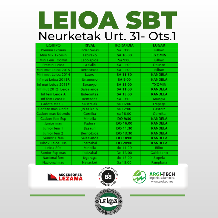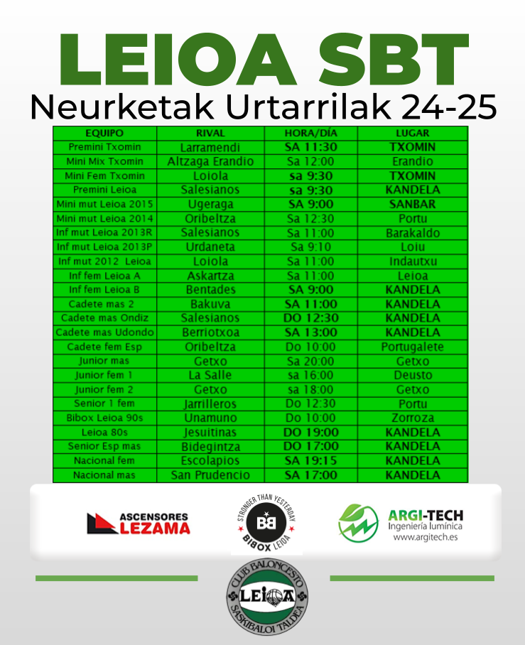 Por la tarde, doble ración de nacional. Los chicos reciben a Santurtzi (Bilbao Basket) a partir de las 17:00, con la mente puesta en dar continuidad a la victoria en Donosti. Partido exigente frente a jugadores jóvenes pero talentosos. Después, a las 19:15h, turno para las chicas, que reciben al líder del grupo, Alzmotors Mutilbasket, que no ha cedido ningún partido hasta ahora. Complicado rival, pero e Kandela, nada es imposible.