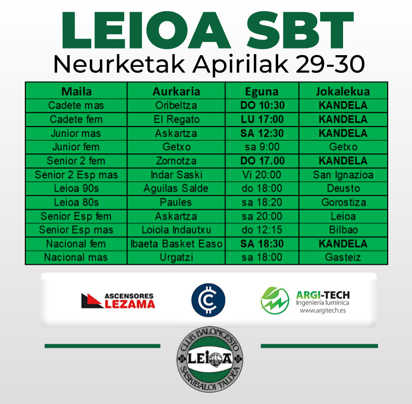 Los chicos de nacional visitan Gasteiz (18:00h), para disputar contra Urgatzi la primera de las tres finales por la permanencia. Mientras que lo el Leioa 80s, Leioa 90s y el senior de especial disputan su partido fuera, con la idea de preparar sus respectivas finales a 4. Las chicas de Joseto y Aitor cierran la temporada en Askartza el sábado a las 20:00h.