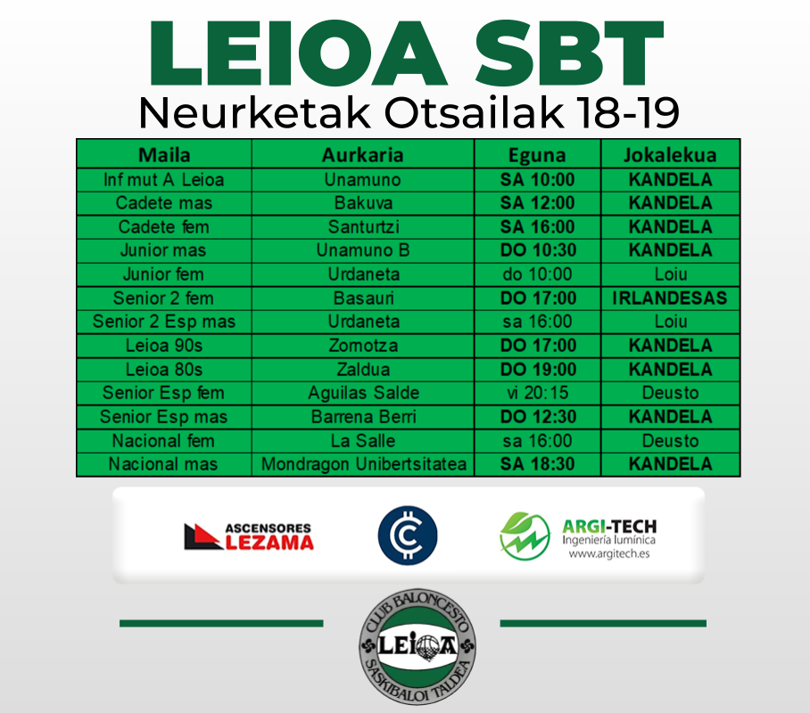 Antes, las cadetes de Asier (16:00) reciben a Jarrilleros, con el objetivo de seguir mejorando y buscando partidos competitivos. El domingo otros cuatro partidos: las infantiles de Maria y Alex juegan partido aplazado contra Larramendi (11:00); las chicas del senior provincial de Iker y Carlota reciben a Erandio Altzaga (13:00h); mientras que por la tarde cierran la jornada los dos equipos de “jóvenes veteranos”, el Leioa 90s recibe a Salleko (17:00h) y el Leioa 80s a Erandio (19:00h).