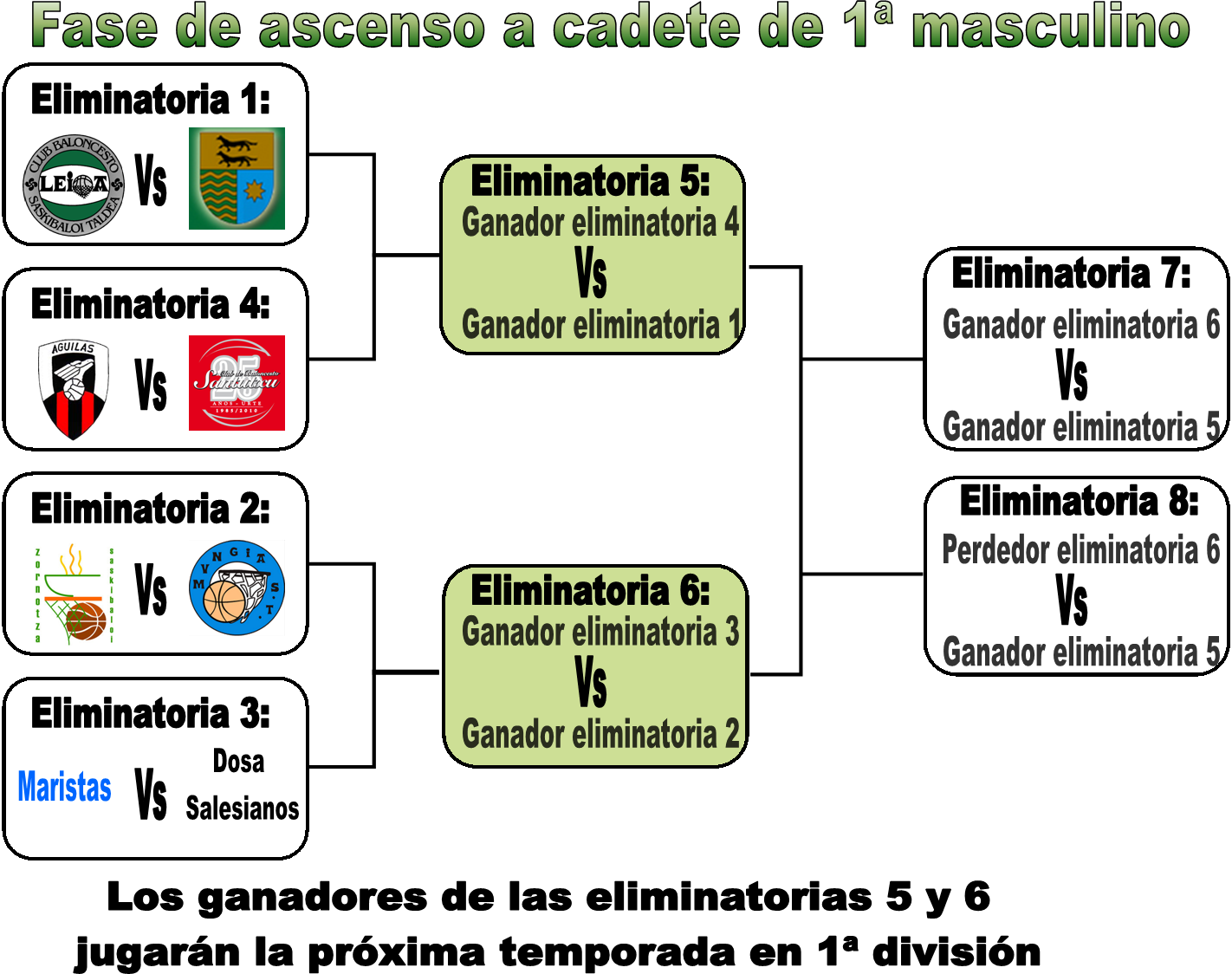 Los cadetes de segunda nos jugamos todo en las próximas semanas. Primero nos toca un doble enfrentamiento de ida y vuelta contra Munabe, a priori accesible. Como hemos quedado primeros de grupo, nos enfrentamos al último clasificado de 1ª. Y en caso de ganar tendremos una segunda eliminatoria en juego. El ganador de la segunda eliminatoria será quien consiga una plaza en 1ª.