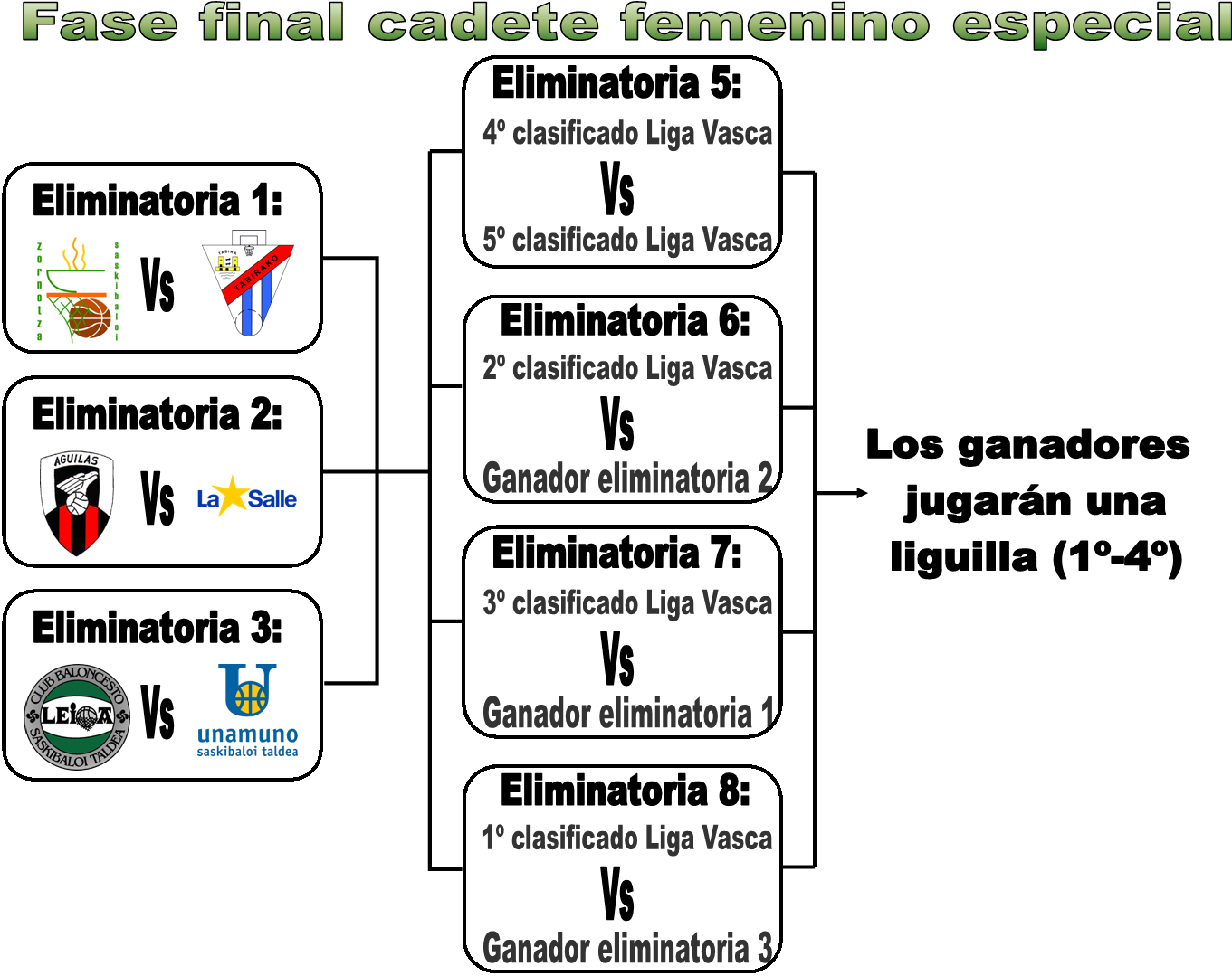Es un cruce a doble partido en el cual se enfrentan los primeros equipos clasificados de cada grupo de cadete especial femenino: 1º contra 3º, 2º contra 2º, 3º contra 1º. En este caso el rival de nuestro cadete será Unamuno. Si se la eliminatoria se pasará a la siguiente fase y nos enfrentaríamos al primer equipo vizcaíno de Liga Vasca, que sería Tabirako. Pero hay que ir pasito a pasito, ya que no vale de nada creernos superiores a Unamuno y pensar en Tabirako sin haber ganado aún la primera eliminatoria. En un cruce puede pasar cualquier cosa, y queremos ir partido a partido.